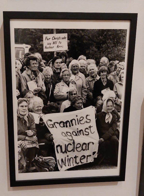The exhibition is full of diverse materials and there is so much to see and to comprehend. The source materials are phenomenal. It concludes with women’s response to Section 28, the gradual visibility and recognition of lesbian communities, and reaction to the AIDS epidemic. This may seem intense, the subject is but the curation of the show draws out the sincere intentions of the inaugurators of women’s movements. In turn, willingly endorsed by wide age-groups, from youths to grannies, especially those that set up the Greenham Common Women’s Peace Camp, from September 1981, to protest against nuclear bombs, the cruise missiles being stored at RAF Greenham Common in Berkshire. (see photograph)